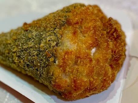 Rolo de alga nori, com arroz japonês e cream cheese, empanado com farinha panko e então frito. Com recheio de salmão gralhado, com mais cream cheese, cebolinha e gergelim. Aproximadamente 19cm. Acompanham 4 molhos à sua escolha.